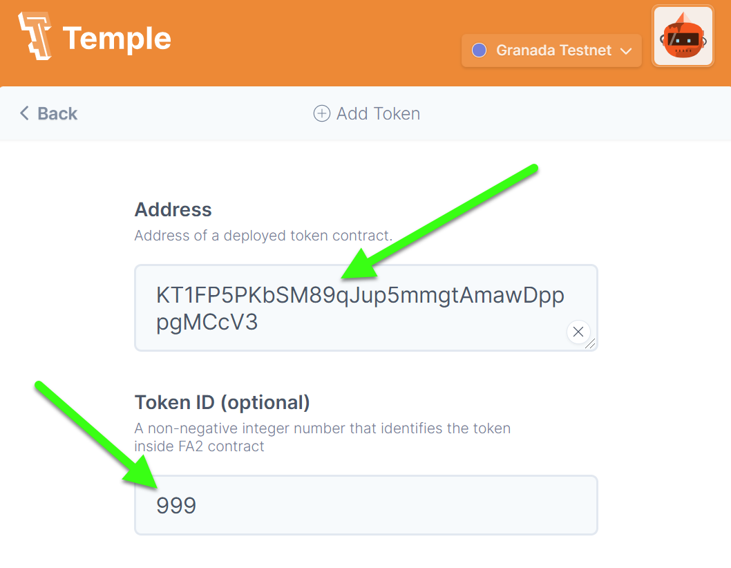 Add the Synth Swap contract address KT1FP5PKbSM89qJup5mmgtAmawDpppgMCcV3 and a token ID from the list (999 for sUSD, 1 for sBTC, 8 for sXTZ etc).