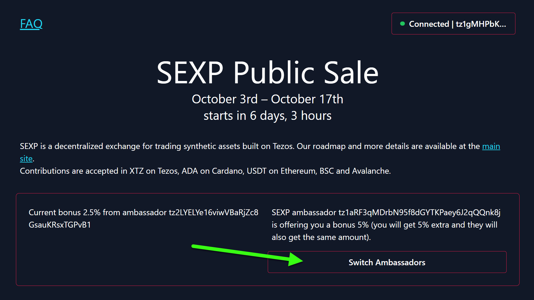 Connect a Tezos wallet that you want to receive SEXP tokens to according to the Public Sale guide.
