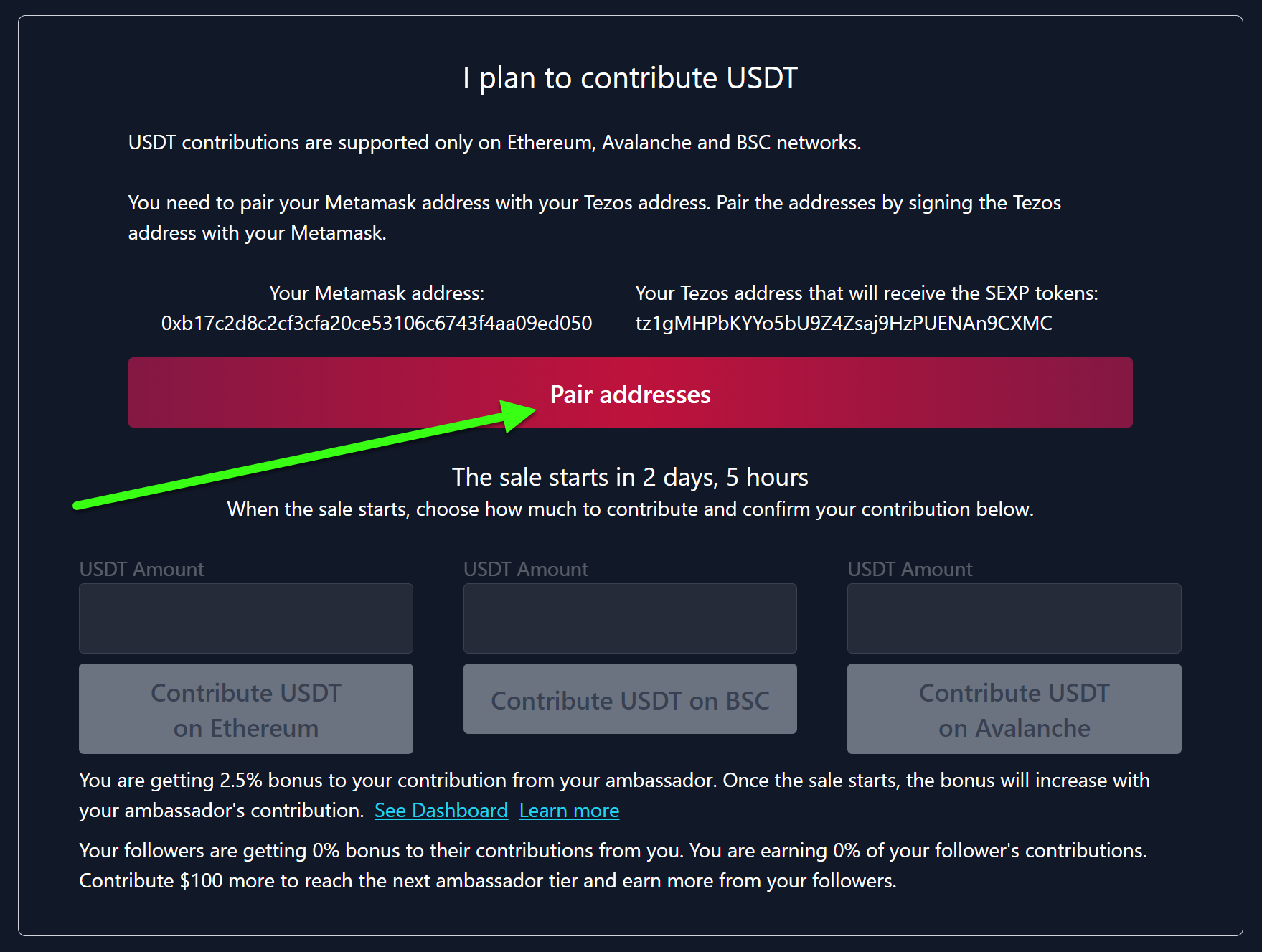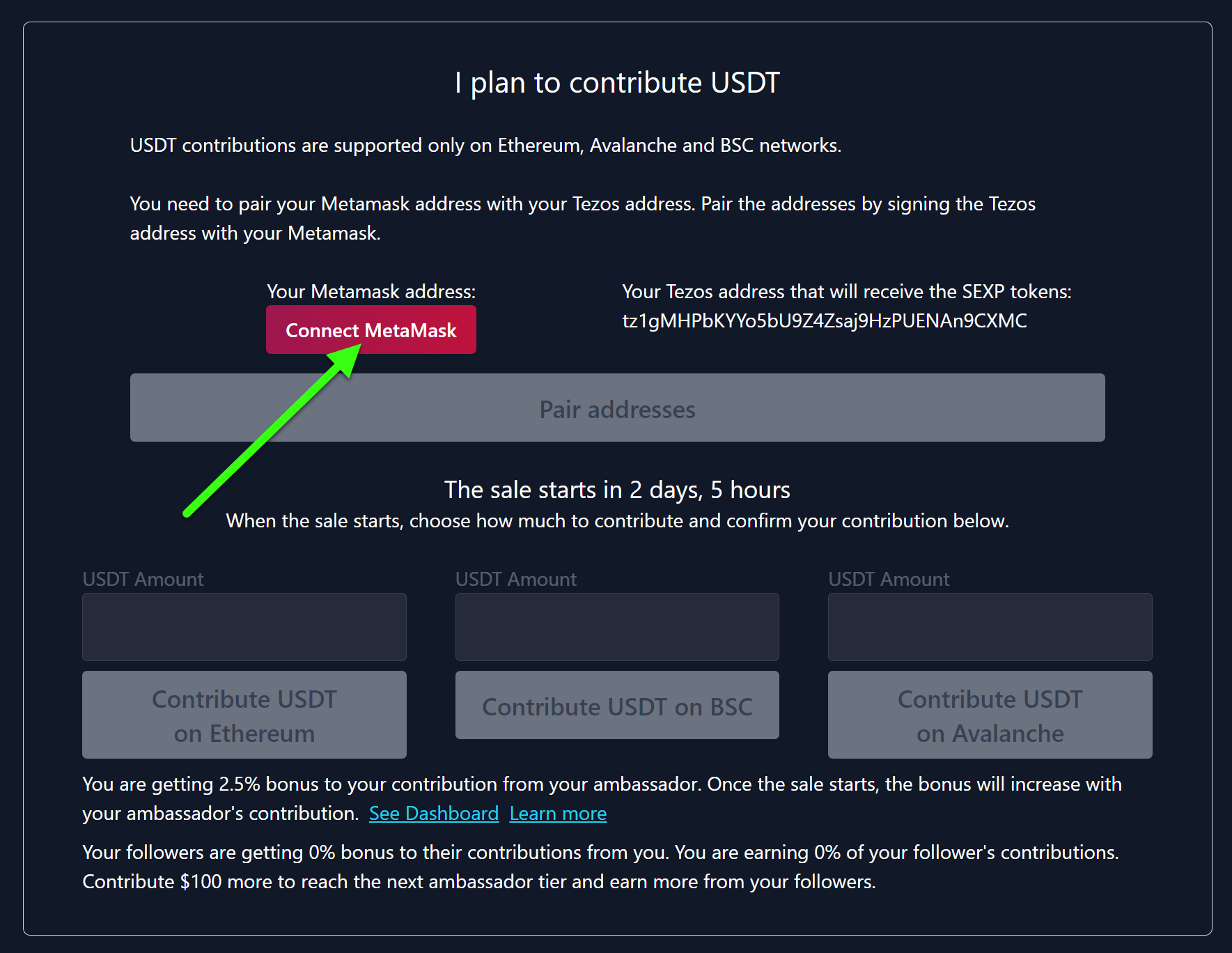 Choose your preferred Ethereum, Binance Smart Chain, or Avalanche address in your MetaMask. Go to the I plan to contribute USDT section and click on Connect MetaMask.
