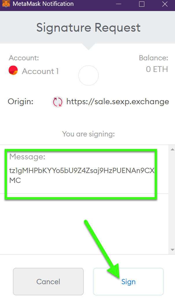 A new MetaMask window will open, asking you to sign a message containing the Tezos address you have chosen to receive SEXP tokens to. Click on Sign.